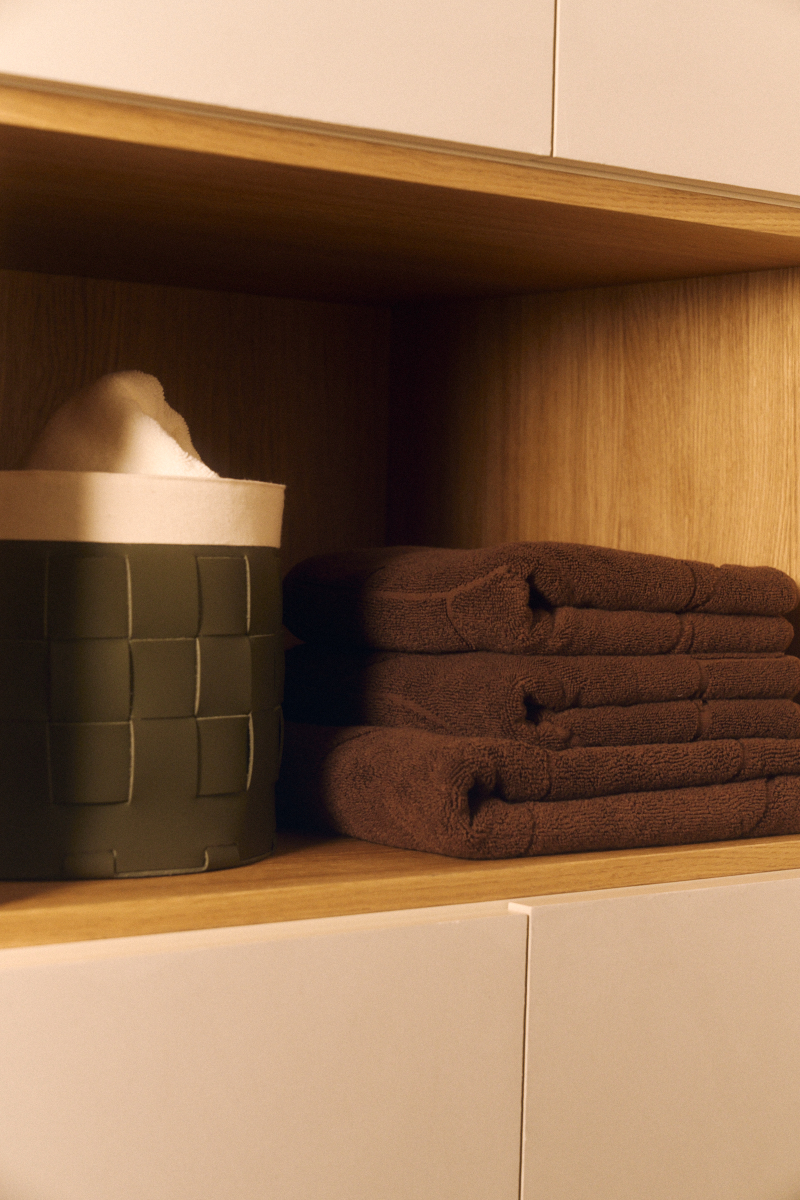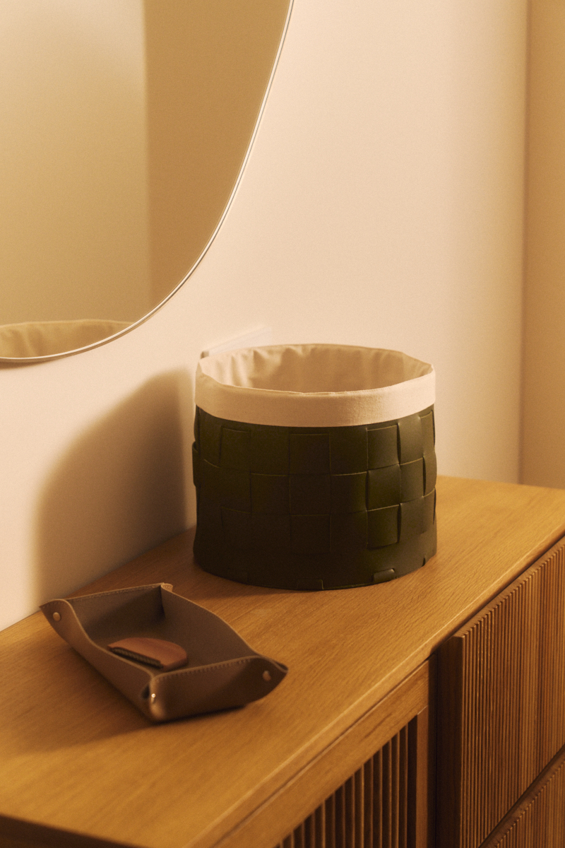 Плетеная корзинка из плотной кожи предназначена для хранения вещей и аксессуаров.
