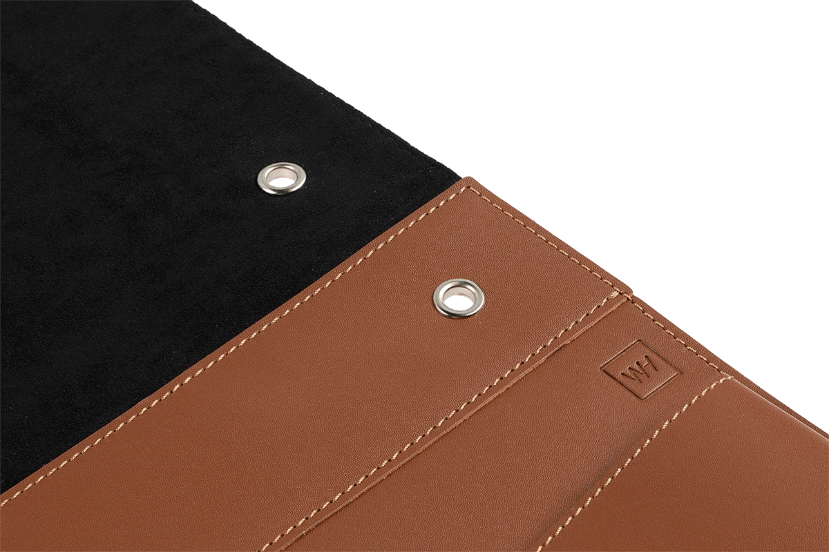 В изделии есть 3 лаконичных отделения на кобурных кнопках для вещей разных размеров, которые нужны нам каждый день. На левой стороне расположились два компактных кармана для мелочей, на правой — один большой карман для бутылки воды или вещей побольше.
