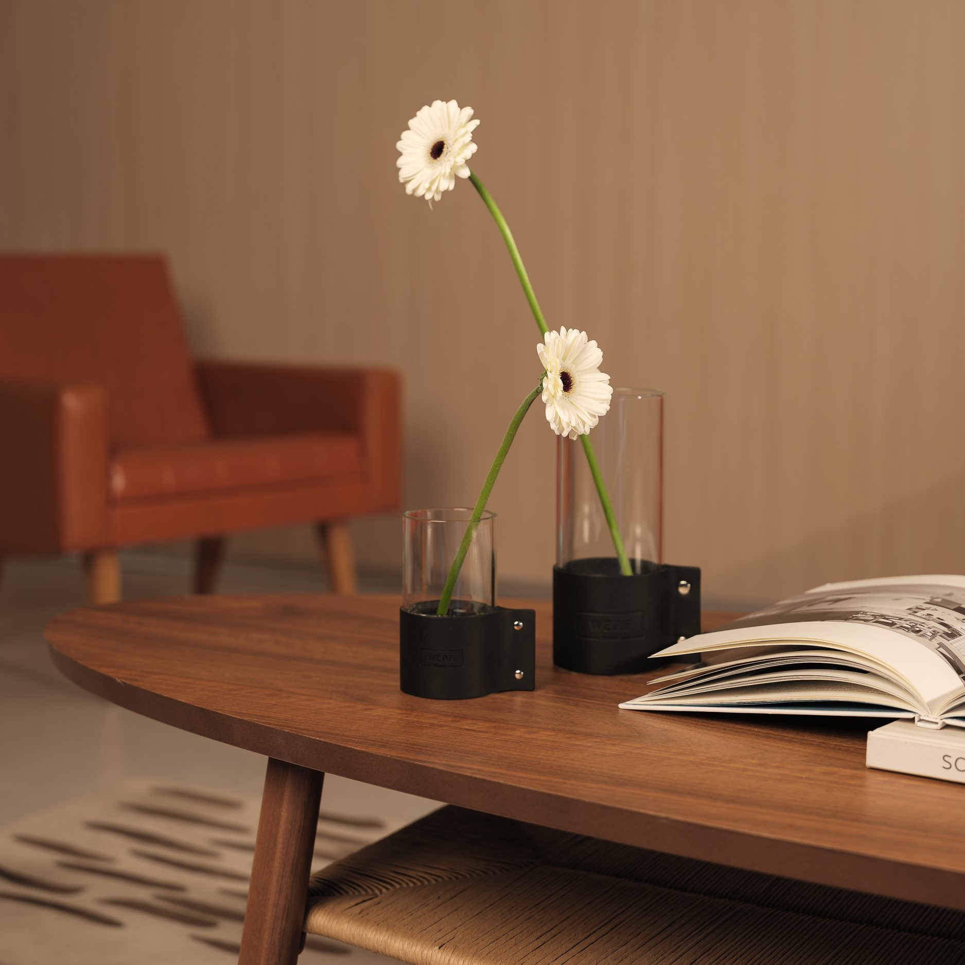 Элегантный и стильный дизайн позволяет вазе-подсвечнику гармонично вписаться в любое пространство, будь то гостиная, спальня или столовая. Вы можете использовать его в качестве самостоятельного акцента или сочетать с другими колбами разного размера и цвета, создавая уникальные композиции. Колба из боросиликатного термостойкого стекла представлена в двух размерах и дополнена сменным холдером из натуральной кожи. Холдер представлен в четырех различных цветах, что позволяет легко менять цвет, создавая новые образы и настроение в вашем пространстве.