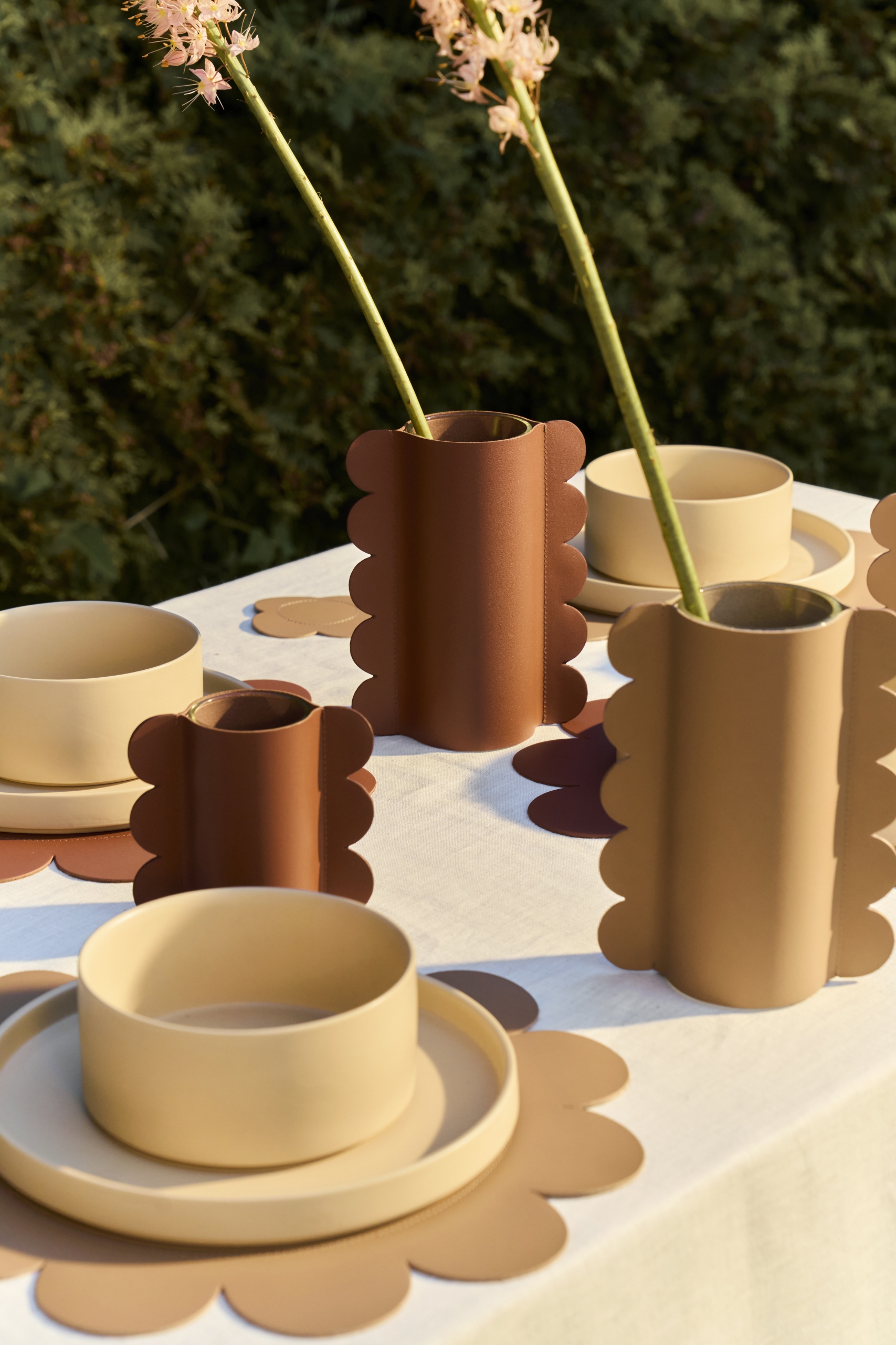 Ваза из лимитированной коллекции VERANDA. Основа вазы – боросиликатное термостойкое стекло. Покрытие — чехол из натуральной кожи с округлым лепестками на боках.