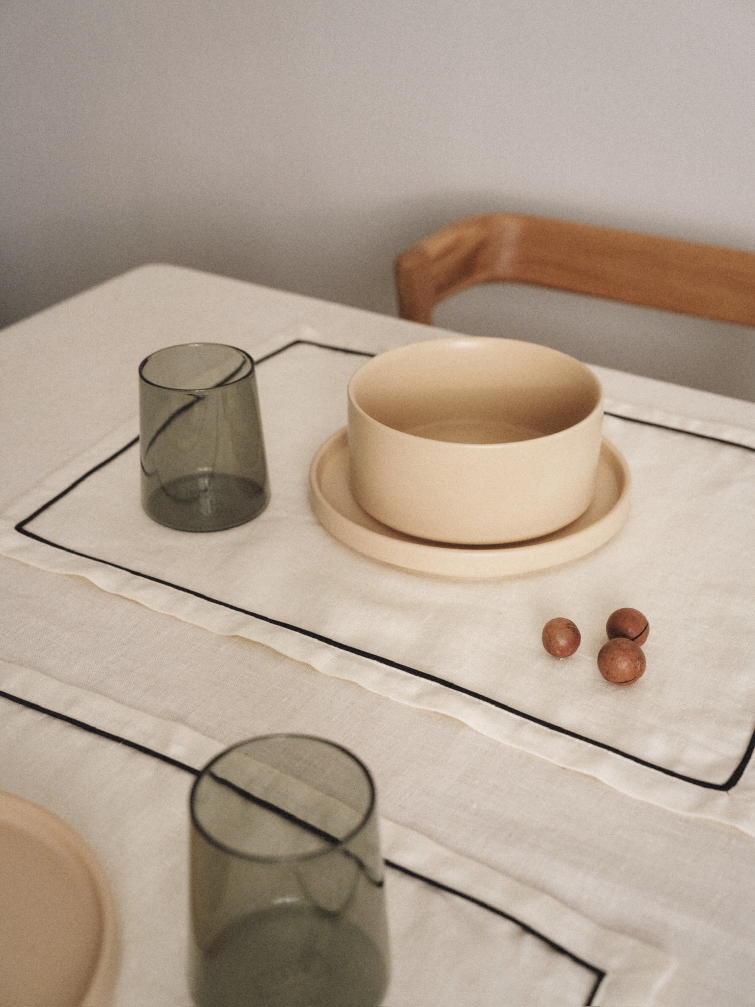 Нежный кремовый оттенок создает атмосферу уюта, а контрастный черный кант создает стильные и графичные силуэты. Салфетки легко комбинируются с разнообразной посудой и текстилем, позволяя создать гармоничное оформление стола, которое впечатлит ваших гостей.